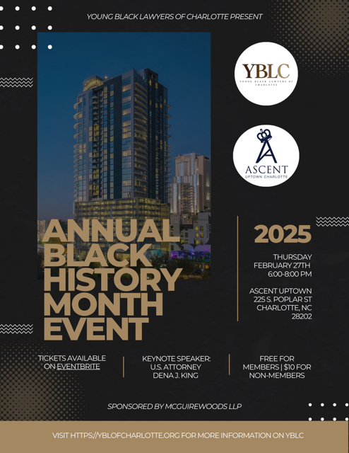 Come out and celebrate Black History Month with YBLC! We are excited to have U.S. Attorney Dena King as our keynote speaker. We will also have food, drinks, DJ, and more. Please don't miss out on this opportunity to network with other amazing young, black attorneys in the Charlotte area.